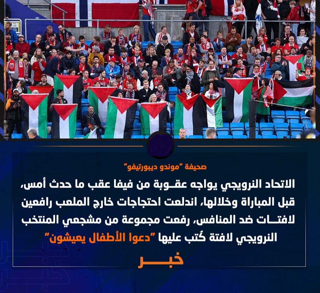 "هتافات من أجل غزة تُربك الفيفا.. تحقيق عاجل ضد الاتحاد النرويجي بعد خماسية الكيان الصهيوني"
